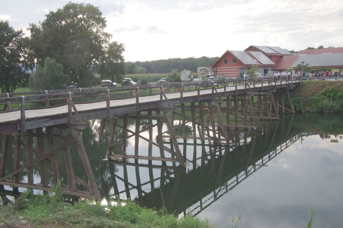 Otvoritev nadomestnega mostu čez Krko. Rušenje starega avgusta.