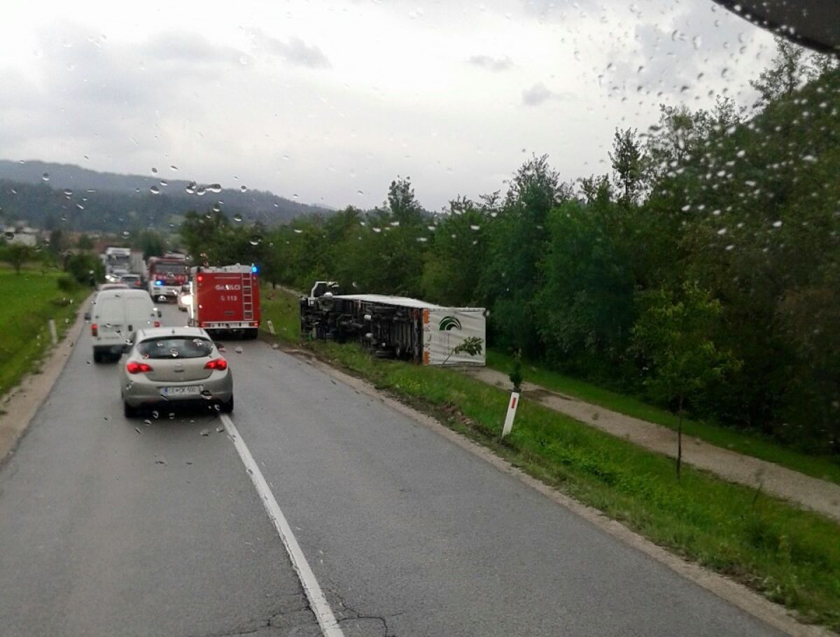 Okoli 8.40 se je na cesti med Mozirjem in Nazarjami, v bližini Delejevega jezu, tovorno vozilo prevrnilo na bok. Zaradi odstranjevanja prevrnjenega tovornega vozila je cesta polovično zaprta in promet poteka izmenično enosmerno, so sporočili s prometnoinformacijskega centra.