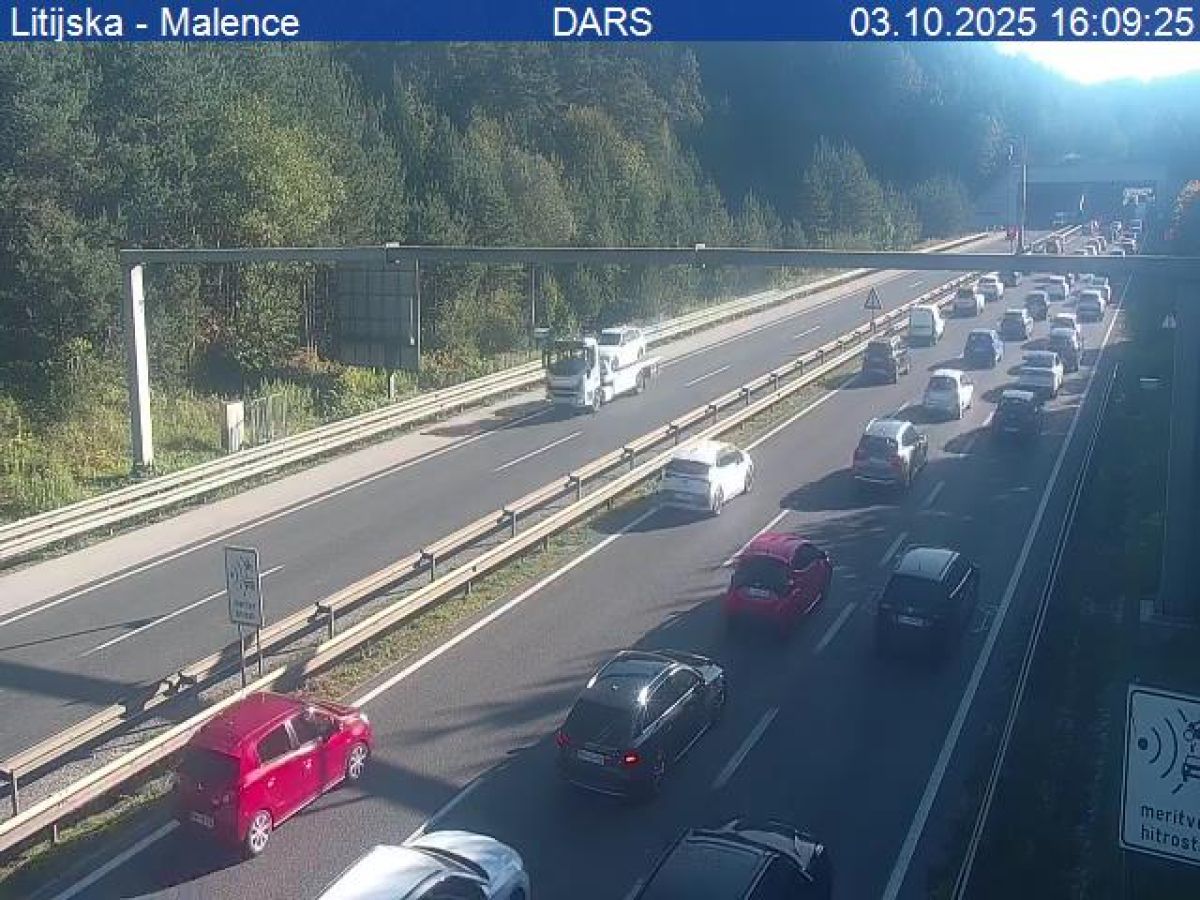 Zastoj jezaradi del na dolenjski avtocesti med priključkoma Mirna Peč in Novo mesto zahod proti Obrežju. Iz istega razloga je zastoj na cesti Koper-Dragonja pri odcepu za Gažon. Na cestah Vodice-Moste in Mengeš-Moste so zastoji zaradi prireditev.