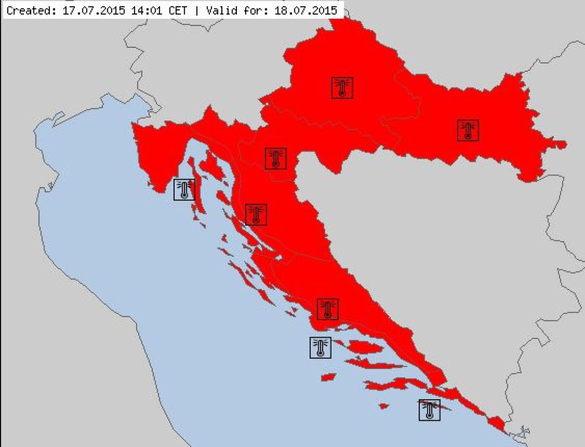 Vročinski val je zajel tudi sosednje države. Za tiste, ki se v teh dneh odpravljate na zasluženi oddih na Hrvaško, velja omeniti, da so hrvaški meteorologi za danes in jutri razglasili rdeči alarm za skoraj celotno območje države, saj napovedujejo temperature zraka, ki bodo nevarne za ljudi. Od sobote do ponedeljka ponekod po državi napovedujejo tudi več kot 38 stopinj Celzija, posebej na skrajnem vzhodu države, v Slavoniji in v notranjosti Dalmacije. Tudi na ohladitev v morju lahko kar pozabite, saj bo temperatura morja v naslednjih dneh tako kot pri nas dosegla 30 stopinj Celzija in več. Podobno vroče bo v sosednji Italiji, Avstriji in na Madžarskem. V naši zahodni sosedi so meteorologi prav tako razglasili rdeči alarm, poleg vročine pa so opozorili na možnost toče.