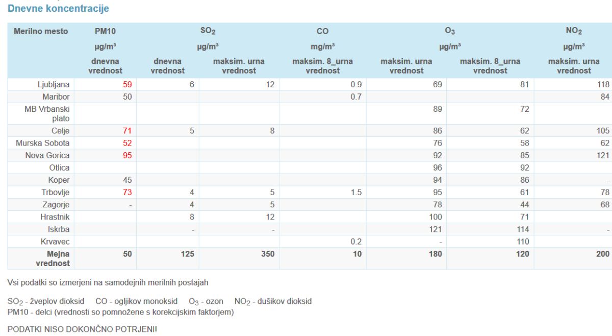 Agencija za okolje opozarja na visoke koncentracije onesnaženosti zraka s prašnimi delci PM10 na območju Zasavja. Včeraj je bila v Trbovljah dnevna vrednost 73 mikrogramov na kubični meter zraka, predpisana dnevna mejna vrednost koncentracije delcev pa je 50 µg/m3. V koledarskem letu je dovoljeno 35 preseganj mejne vrednosti. Visoke koncentracije so bile tudi ponoči. Od polnoči do šeste ure zjutraj je bila koncentracija zmerna, med 93 in 65 mikrogrami, na to pa visoka do 100 in več mikrogramov. Povprečna urna koncentracija med 10. in 11. uro je znašala 116 mikrogramov. Podatkov za Zagorje ARSO ni objavil. Spomnimo pa še, da v naših občinah, ki sodijo v območje čezmerne onesnaženosti zunanjega zraka z delci PM10 in so uvrščene v razred največje obremenjenosti, velja prepoved kurjenja odpadkov na prostem.