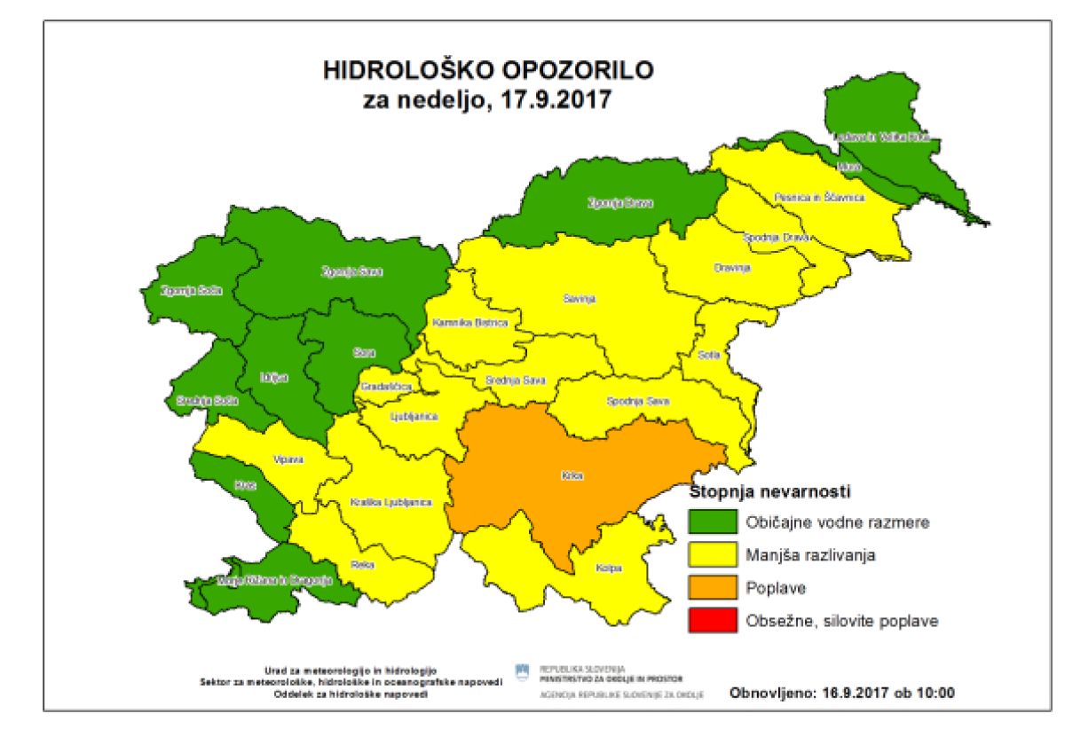 Ljubljanica poplavlja na Ljubljanskem barju. Reke bodo danes po vsej državi močneje naraščale, zlasti v osrednji in jugovzhodni Sloveniji bodo poplavile, predvidoma na območjih pogostih poplav. Ob ponovni okrepitvi padavin v noči na nedeljo in v nedeljo čez dan se bodo poplavne razmere začele stopnjevati. Zlasti reka Krka s pritoki se bo v srednjem in spodnjem toku razlivala na območjih pogostejših poplav. Na izpostavljenih območjih se lahko razlije v širšem obsegu. Kraška polja na Notranjskem in Dolenjskem se bodo ojezerila.