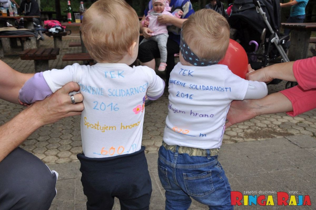 Pridružili smo se Karitasovi pobudi in izvedli Tek podnebne solidarnosti. Namen slednjega je, da tečemo v solidarnosti do ljudi v Afriki, ki so jih posledice globalnih podnebnih sprememb najbolj prizadele, čeprav so zanje najmanj krivi. Ob pomoči naših družinskih članov in vzgojiteljic smo nabrali 44,8 km, ki jih bomo prispevali h krogu solidarnosti, ki se gradi okoli ekvatorja. Že pred tekom smo se poučili o razmerah v Afriki, svoje dobre namene pa smo napisali tudi na naše tekaške majice. Bilo je izredno prijetno, zato nam je pogostitev na koncu seveda zelo prijala.