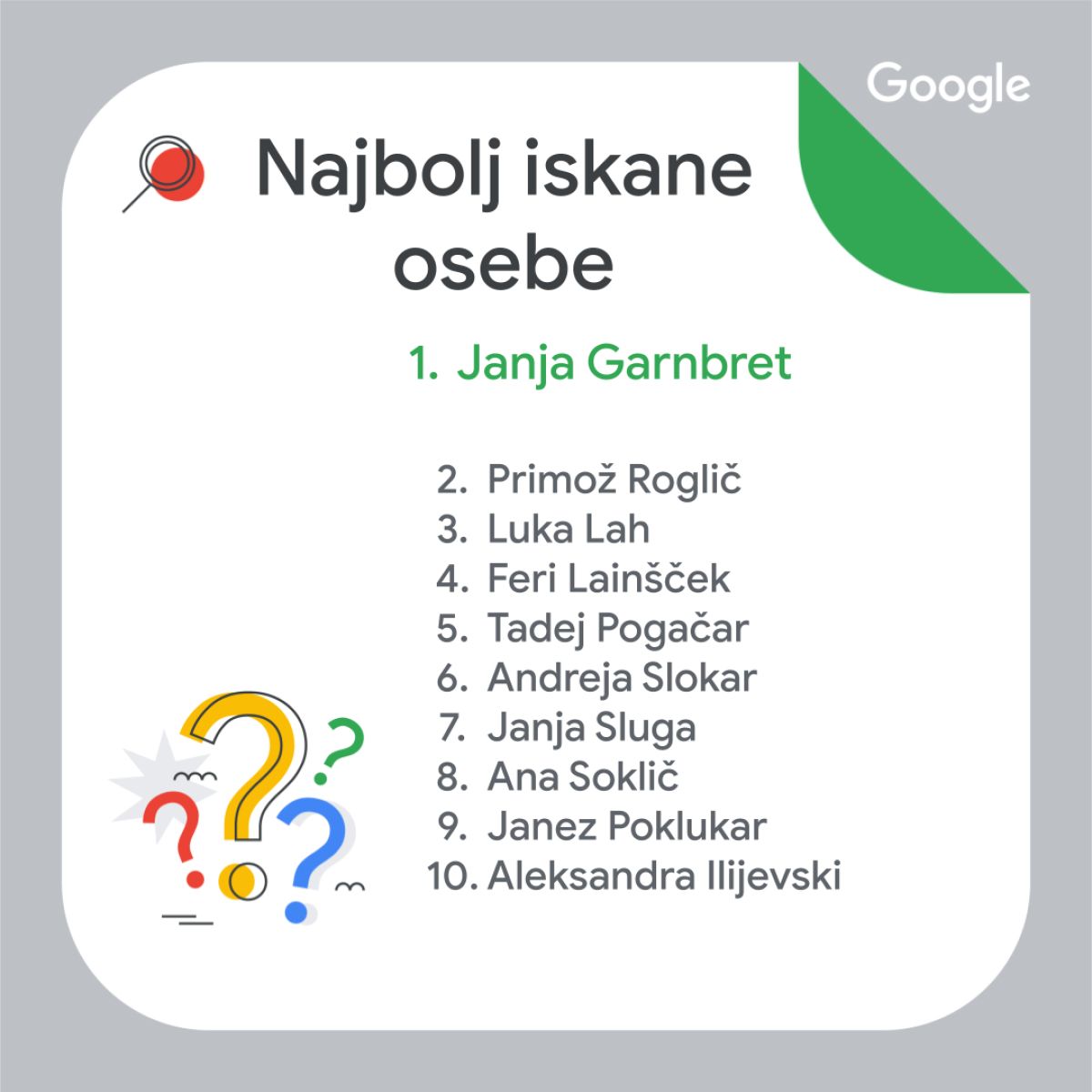 Ne glede na to, da so letošnje leto zaznamovali protesti, prepiri v parlamentu, politično sprejeti ukrepi, pa je očitno, da imamo Slovenci politike čez glavo dovolj. In zato ne preseneča, da sta med 10-imi najbolj iskanimi osebami v letošnjem letu samo dva politika, poslanka Janja Sluga in zdravstveni minister Janez Poklukar. Sicer pa prvo mesto pripada odlični športnici, nosilki zlate medalje iz Tokia, Janji Garnbret. Sledi ji, skoraj razumljivo, prav tako brilijantni kolesar Primož Roglič, na tretje mesto pa se je uvrstil Luka Lah, eden od razvpitih "fantov z rajskih otokov", ki so naredili odličen posel z nabavo hitrih antigenskih testov.