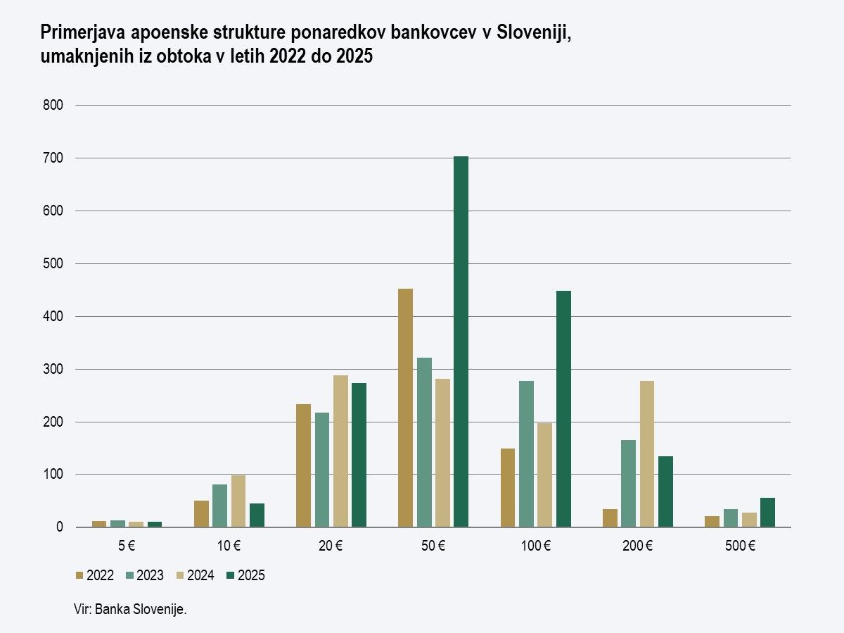 V Sloveniji se je število ponarejenih evrskih bankovcev, umaknjenih iz obtoka, v letu 2025 povečalo glede na leto prej. Verjetnost, da bi v Sloveniji ob rokovanju z gotovino prejeli ponaredek, sicer ostaja relativno majhna, so sporočili iz Banke Slovenije.