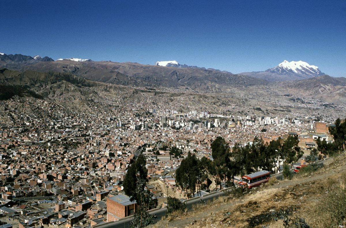 Pred mestom smo se ustavili na robu kraterja z osupljivim pogledom na mesto pred nami v kraterskem žrelu. Tu pred nami je kot na dlani ležalo glavno mesto miru, La Paz (mir iz španščine), ki leži na nadmorski višini 3600 metrov in je najvišje ležeča prestolnica na svetu, z najvišje ležečim mednarodnim letališčem na svetu. Globoko v planoto je reka La Paz zarezala mogočen kanjon, v katerem so po pobočjih razporejene rdeče strehe neštetih hiš La Paza. Sredi razgibane lunarne pokrajine pet kilometrov širokega kanjona živi milijon ljudi, ki imajo prekrasen pogled na triglavi šesttisočak Illimani in najvišji vrh Cordillere Real (Kraljevske verige), ki domačinom predstavlja božanstvo. Izrazite oblike gore Illimani se pojavljajo vsepovsod po mestu, na čokoladnem papirju, poštnih znamkah, pivskih steklenicah in v mestnem grbu.