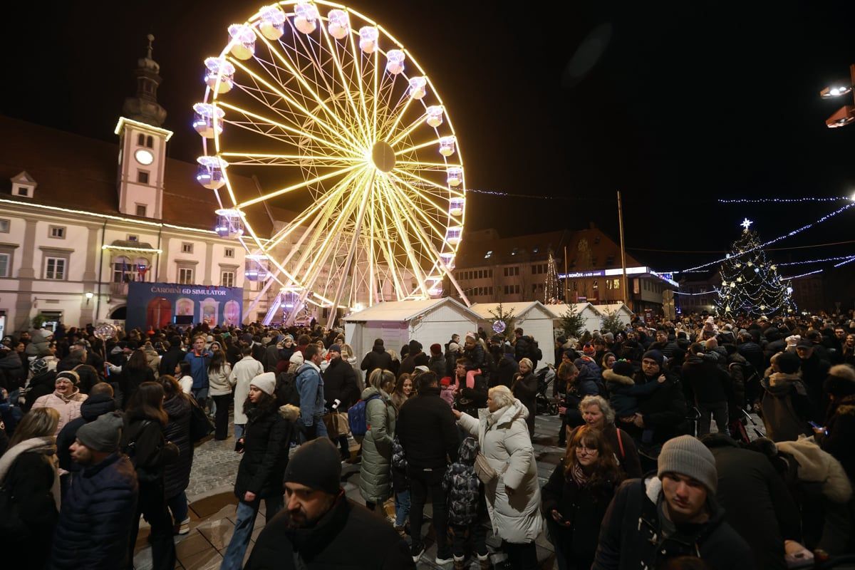 Maribor je zasijal v praznični luči, tudi s pomočjo premierja Roberta Goloba, ki je prižgal 33-metrsko panoramsko kolo nad Glavnim trgom.