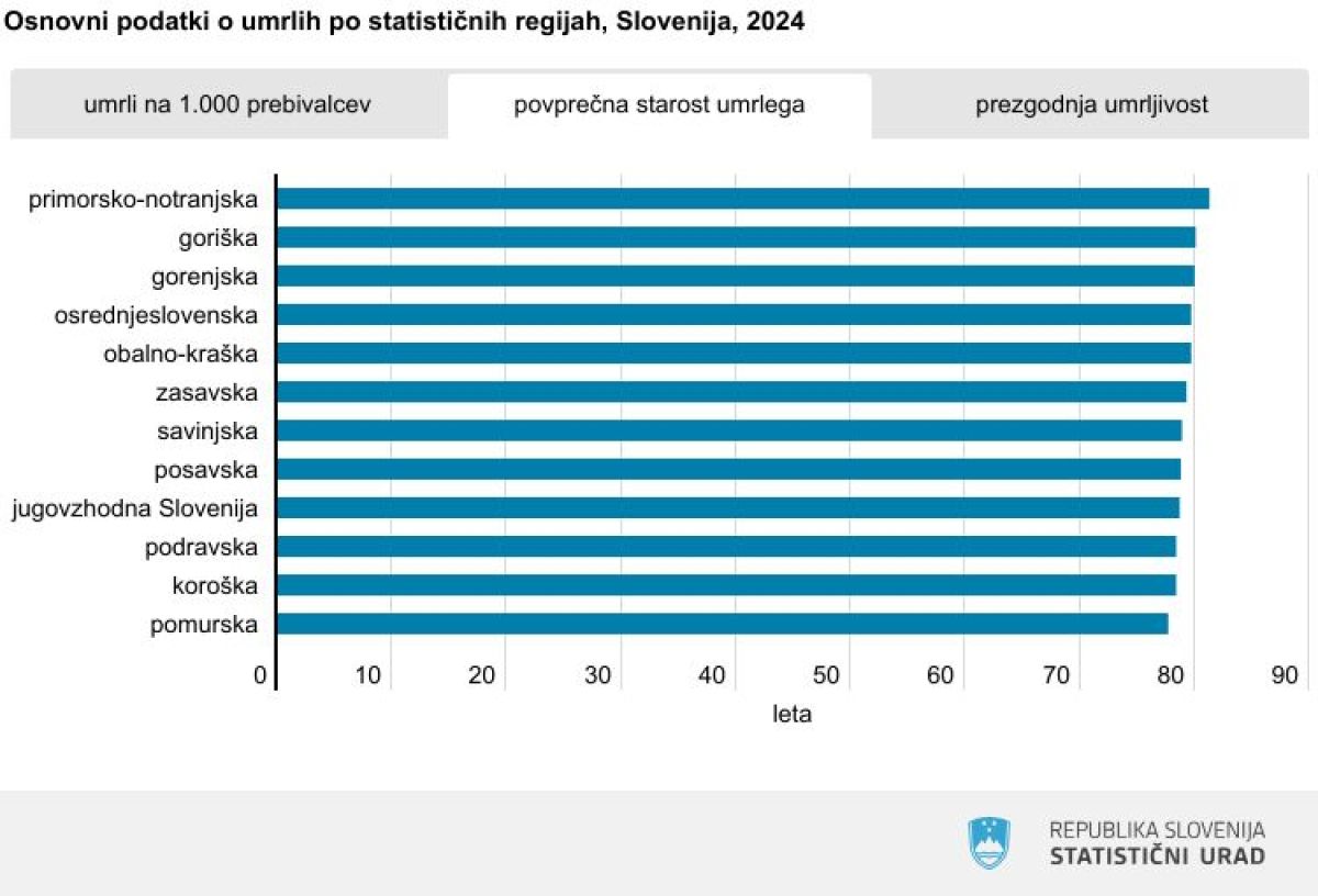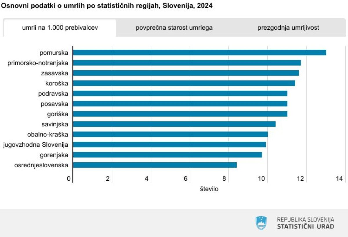 Največ umrlih na 1000 prebivalcev je bilo lani v pomurski (13,0), najmanj pa v osrednjeslovenski statistični regiji (8,4). Povprečje na ravni Slovenije je znašalo 10,1.