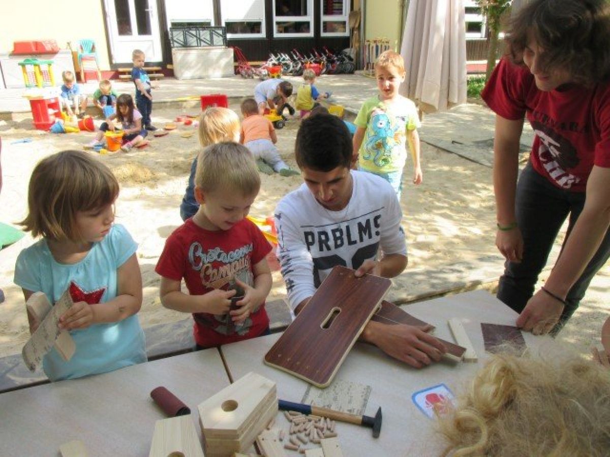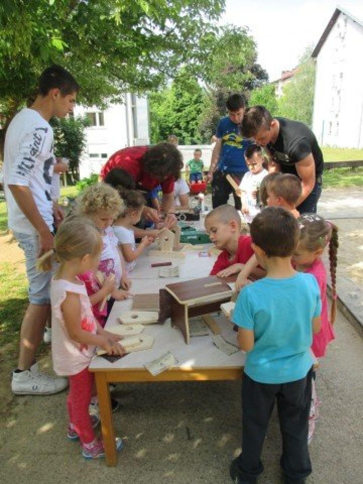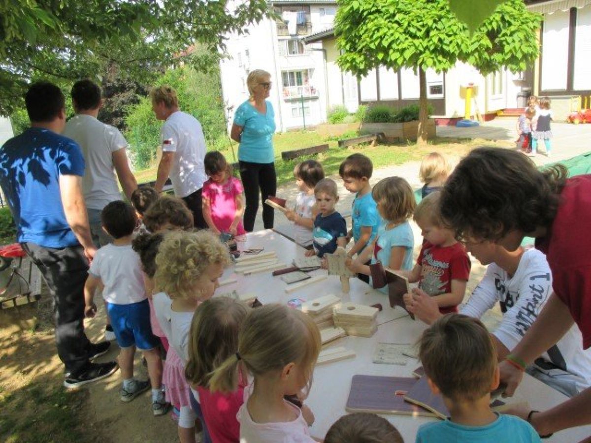 Tako smo v sredo, 20. maja, obiskali malčke v enoti vrtca Rdeča kapica, kjer smo jim preko delavnic predstavili naše lesarske in gradbene poklice. Na letošnjem druženju dijakov z otroci iz vrtca, ki je postalo že tradicionalno, so se malčki preizkusili v brušenju in sestavljanju lesenih pručk in škatlic ter ptičjih hišic. Otroci so lahko na delavnicah pokazali veliko mero otroške domišljije in ustvarjalnosti ter vadili ročne spretnosti. Z našim «Naj dijakom« Tomažem Zupančičem iz razreda L4a pa so otroci prepevali tudi otroške pesmice.