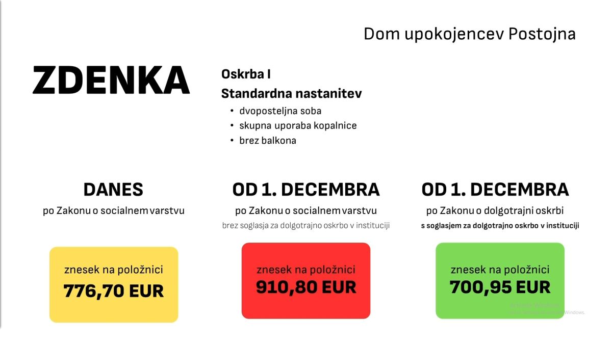Podobno so pokazali izračuni v Domu upokojencev Postojna. Tam oseba, ki potrebuje najmanj oskrbe, za standardno namestitev zdaj plača 776 evrov. Od 1. decembra bi v obstoječem sistemu plačala 910 evrov, v sistemu dolgotrajne oskrbe pa 700 evrov, je dejala direktorica doma Belcer Premrl.