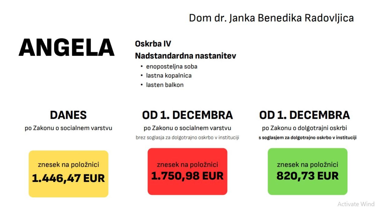 V Domu dr. Janka Benedika Radovljica zdaj cena za standardno namestitev za tiste, ki potrebujejo najmanj oskrbe, znaša 760 evrov. S 1. decembrom bi se za tiste, ki bi ostali v obstoječem sistemu, zvišala na 912 evrov, za tiste po zakonu o dolgotrajni oskrbi pa bi se znižala na 713 evrov.