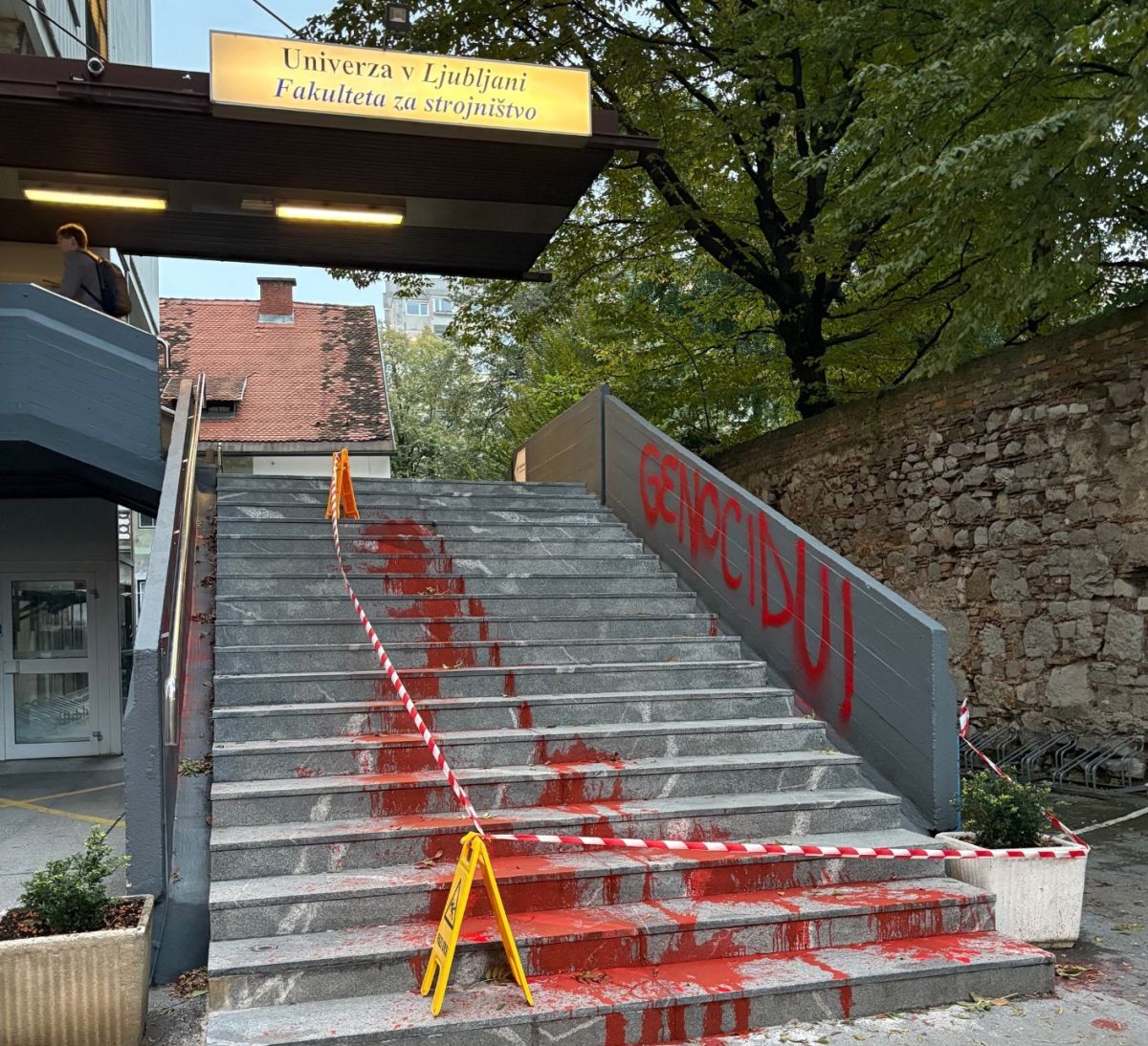 Na vhodu v ljubljansko Fakulteto za strojništvo so ponoči neznanci stopnice pobarvali z rdečo barvo in ob tem na ograjo prav tako z rdečo napisali Stop genocidu.