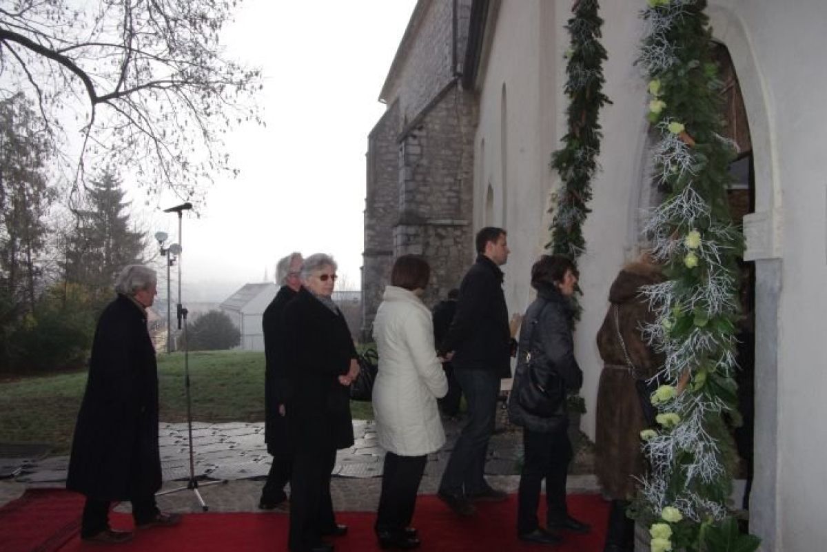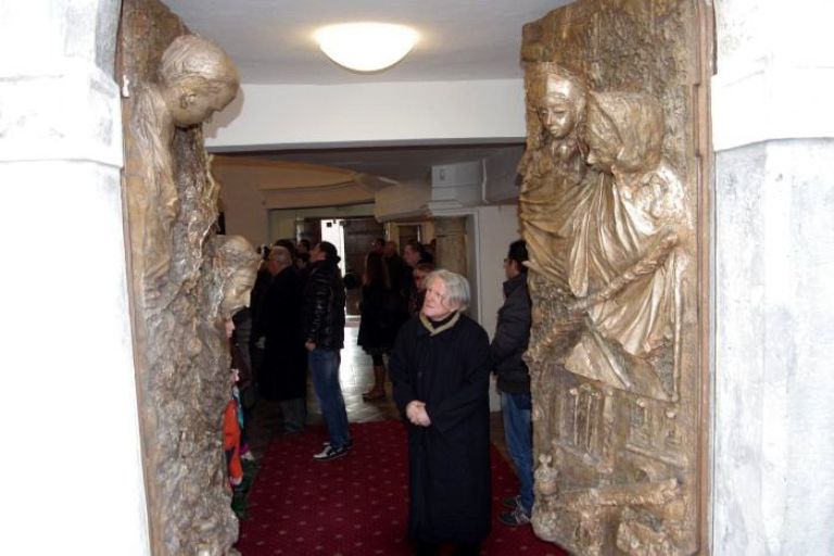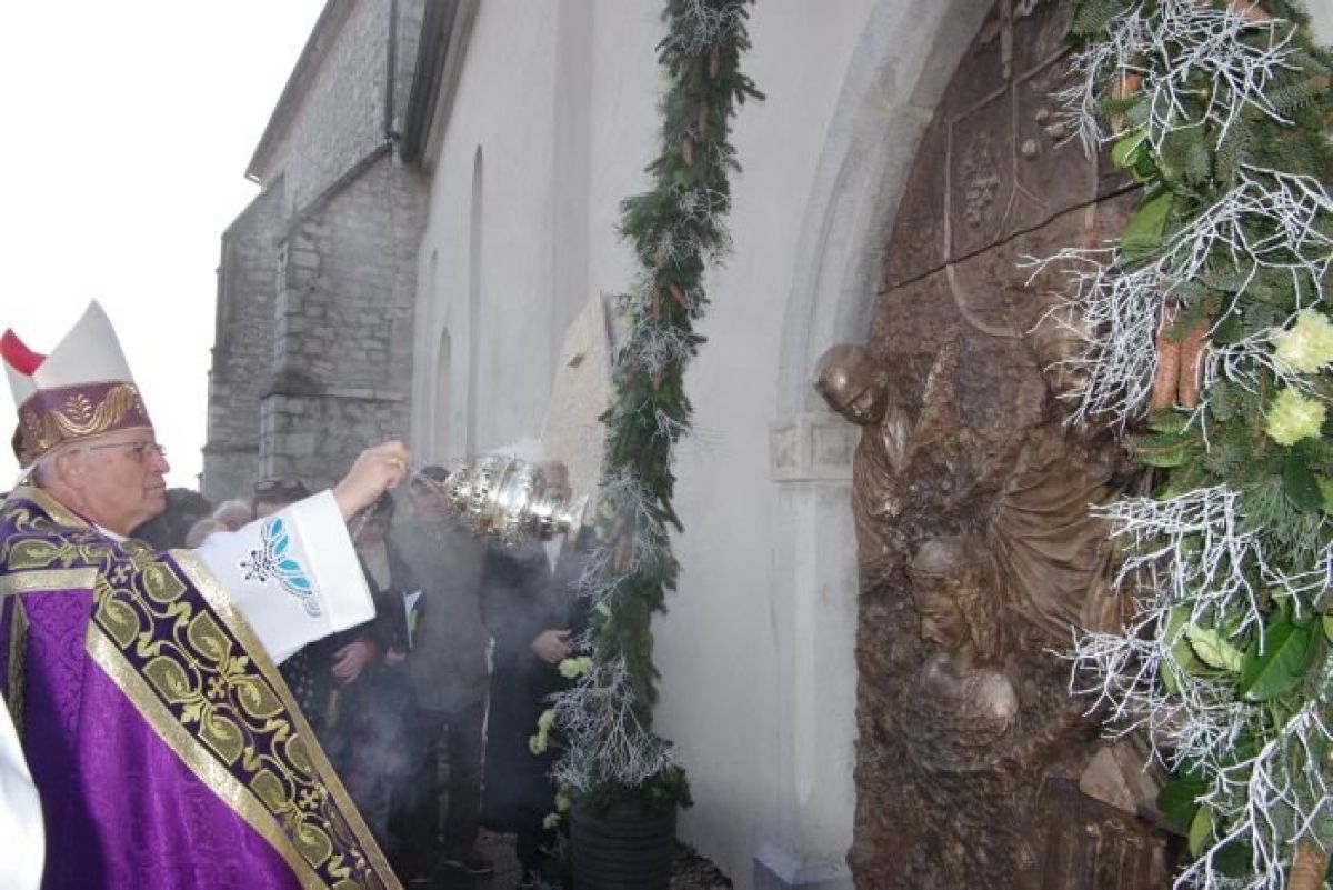 Vrata, ki so pravo umetniško delo priznanega akademskega kiparja Mirsada Begića in na katerih je v bronu upodobil obličja treh dolenjskih blaženih: neuklonljivega branilca krščanskega prepričanja Alojzija Grozdeta, dve izmed drinskih mučenk, redovnic »hčera božje ljubezni«, sester Krizine Bojanc in Marije Antonije Fabjan ter ustanovitelja Novega mesta, habsburškega cesarja Rudolfa 4. ter novomeški kapiteljski grb in arheološke izkopanine - so bila do danes dopoldne zakrita. Škof jih je slovesno odprl in skoznje so v cerkev stopili zbrani duhovniki in verniki. Na dogodku je bil tudi umetnik Begić.