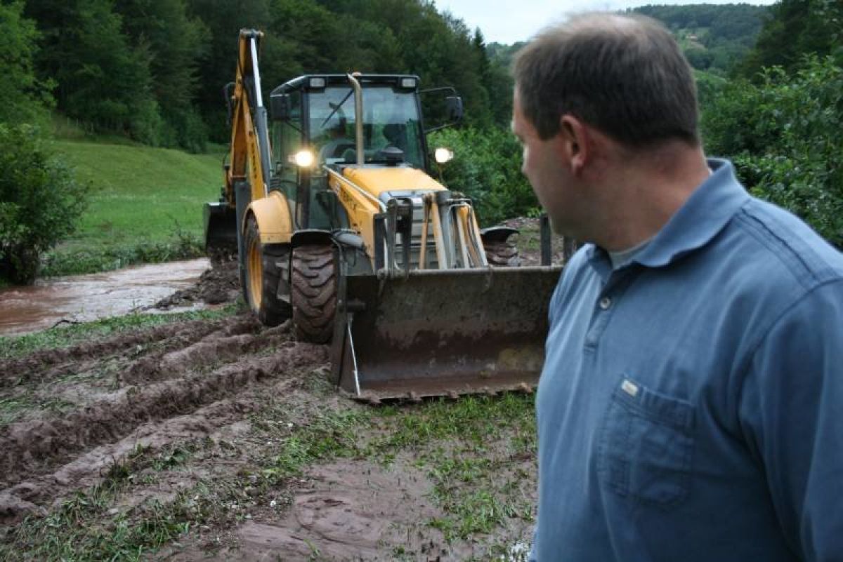 "Hvala bogu, da imamo tako pridnega predsednika, da nam je takoj priskočil na pomoč z mehanizacijo," hvali Marija Boštjana Krmelja. Do večera so Skubčevim poglobili strugo Hinje in ponovno namestili brv.