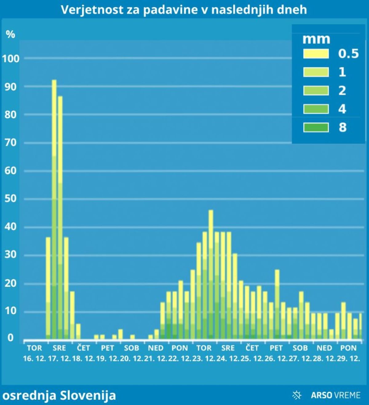 Čez dan se bo z juga oblačnost razširila na večji del države. Ponoči se bodo ob gorskih pregradah zahodne Slovenije začele pojavljati rahle padavine in se v sredo zjutraj nekoliko širile proti vzhodu. Meja sneženja bo visoko, nad okoli 1800 metri nad morjem. Le na skrajnem severovzhodu bo večinoma ostalo suho. Padavine bodo do večera postopoma povsod ponehale.