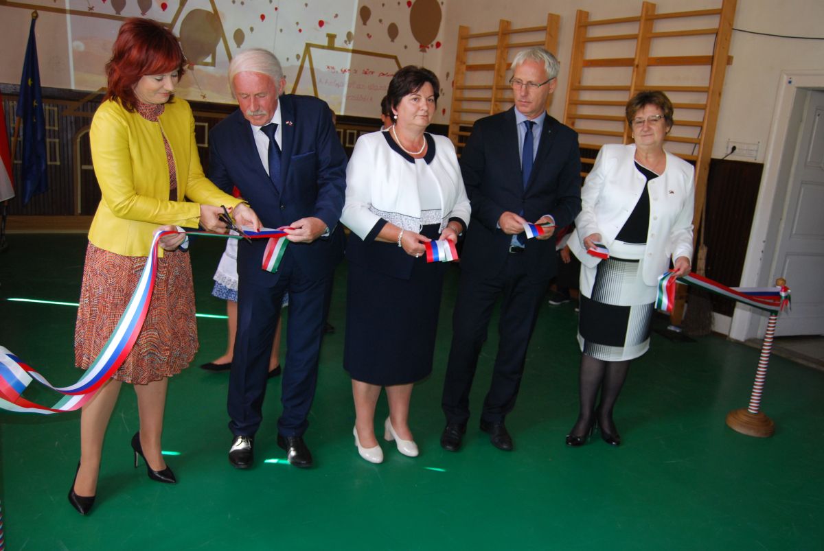 V kulturnem programu so se šolarji predstavili s pesmijo, plesom in recitacijami. Slavnostni trak so prerezali (od leve): generalna konzulka Republike Slovenije v Monoštru Metka Lajnšček, Martin Ropoš, ravnateljica šole Ildikó Dončec Treiber, Miklós Soltész in zagovornica Slovencev v madžarskem parlamentu Erika Köleš Kiss.