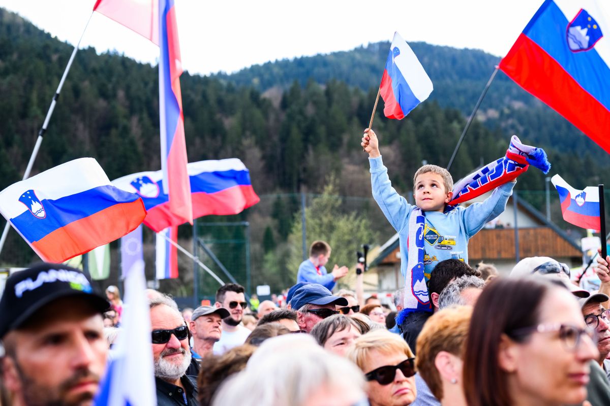 Med gledalci s slovenskimi zastavami pod odrom je bil tudi gospod iz Banjaluke, ki je v značilnem bosanskem pokrivalu le zaradi sprejema prišel v Slovenijo. "Daj me slikaj še od zadaj," je dejal fotografu STA. Ko se je obrnil, so bili zadaj na pokrivalu z rdečo izpisani trije svetovni rekordi družine Prevc. "A vidiš, ta prvi je za pa Perota," je spomnil na Petra Prevca. Slednji je po Jožetu Šlibarju kot drugi slovenski skakalec postavil svetovni rekord, prvi v zgodovini je 2015 preletel 250 metrov, svetovna rekorderja sta zdaj tudi njegova sestra in brat Nika ter Domen.