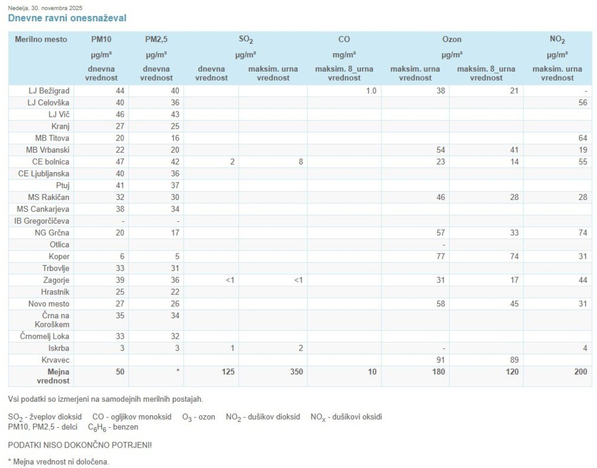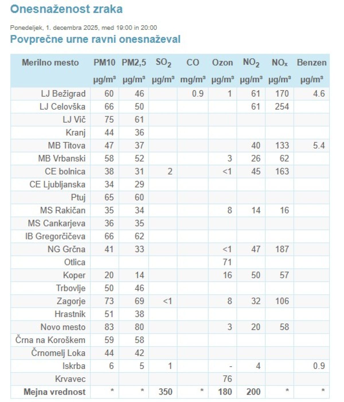 PM2,5: Novo mesto 80, Zagorje 69, Il. Bistrica Gregorčičeva 62, LJ Vič 61, Ptuj 60, Črna na Koroškem 58, Maribor Vrbanski 52, LJ Celovška 50, ...