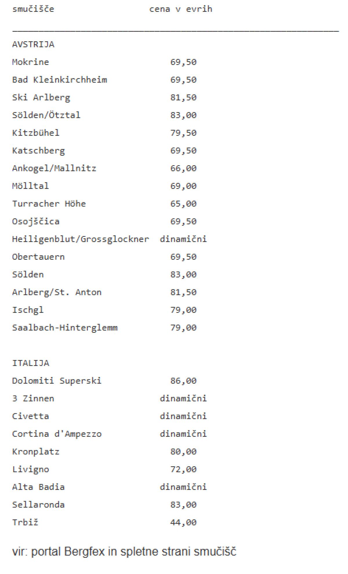 Cene vozovnic na številnih smučiščih v Italiji in Avstriji, priljubljenih tudi med Slovenci, so se letos znova zvišale. Na največjih avstrijskih smučiščih so se prvič povzpele nad 80 evrov. Nekaj prihranka ponujajo sezonske in večdnevne vozovnice, pa tudi nakupi v predprodaji in prek spleta.
