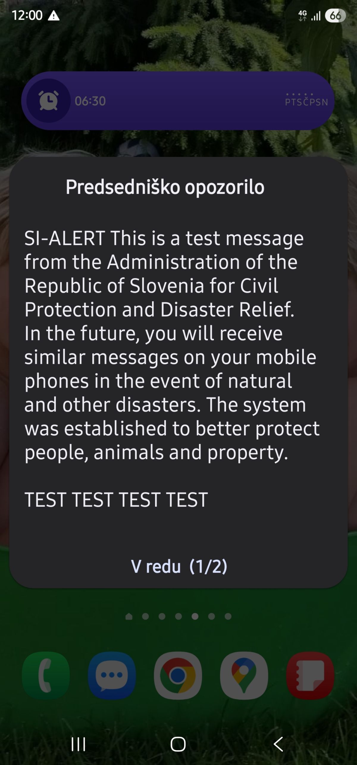 Ob 12. uri bi morali obvestilo SI-Alarm prejeti vsi, ki so bili prijavljeni v slovensko omrežje. Številni sporočajo, da obvestila sploh niso prejeli.