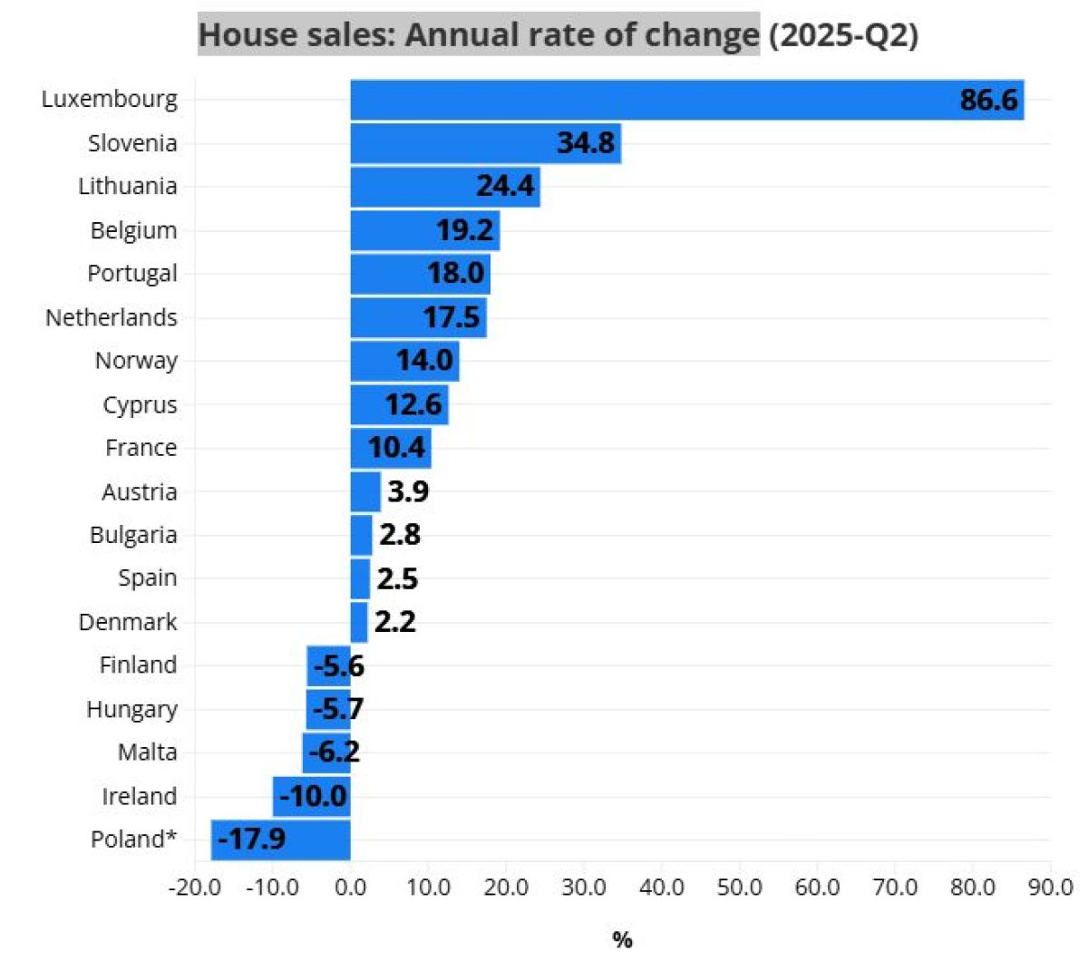 Prodaja stanovanjskih nepremičnin v Evropski uniji se je v drugem četrtletju leta v primerjavi z enakim obdobjem leta 2024 povečala za 10 odstotkov. Če izvzamemo Luksemburg, kjer se zaradi majhnosti trga hitro zaznajo padci ali porast – tam se je prodaja povečala za 86,6 odstotka, je Slovenija na prvem mestu. Po podatkih Eurostata se je obseg prodaje povečal za 34,4 odstotka.