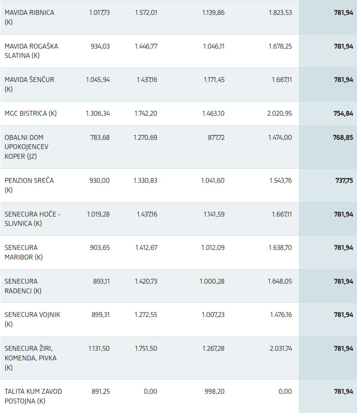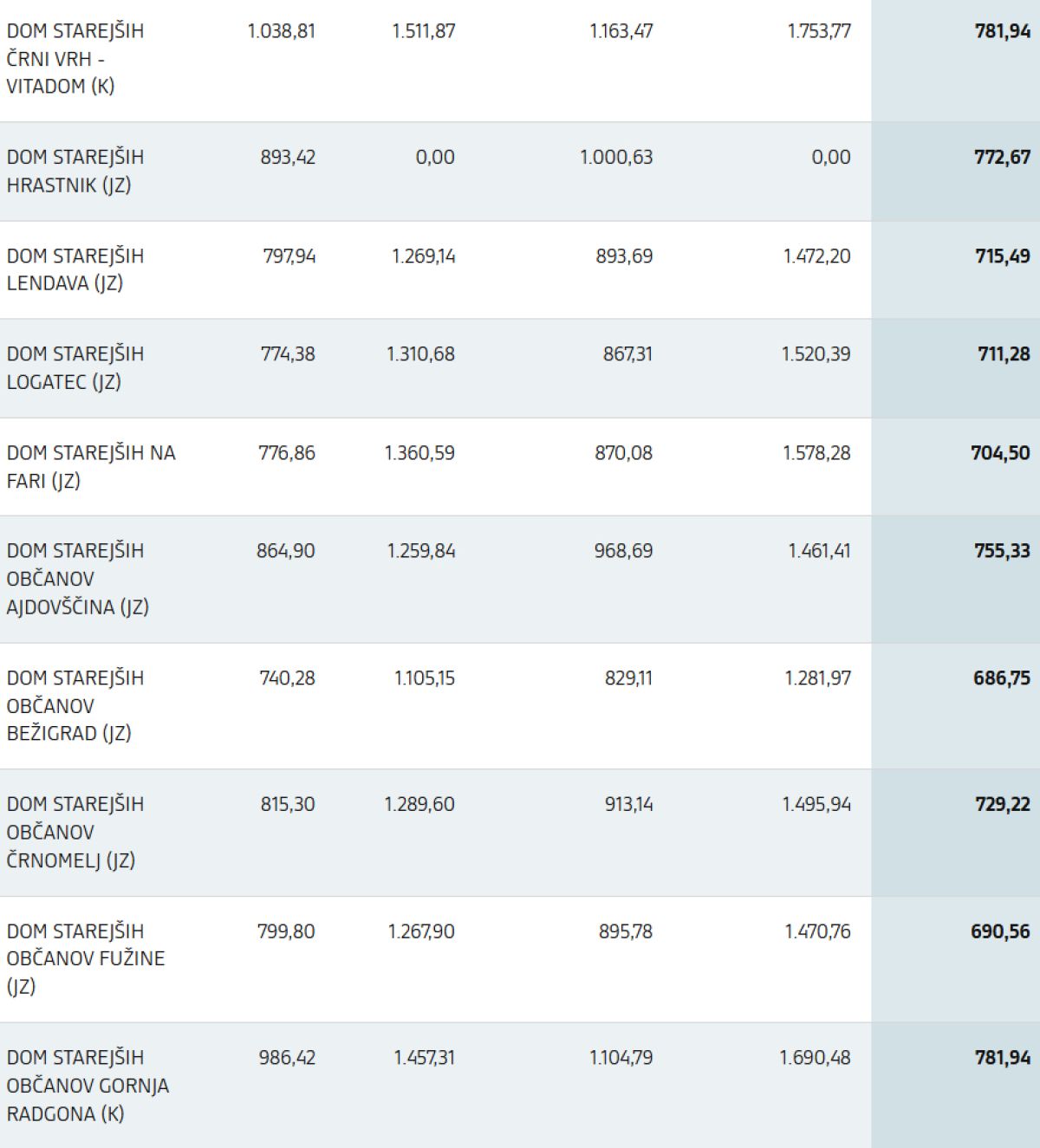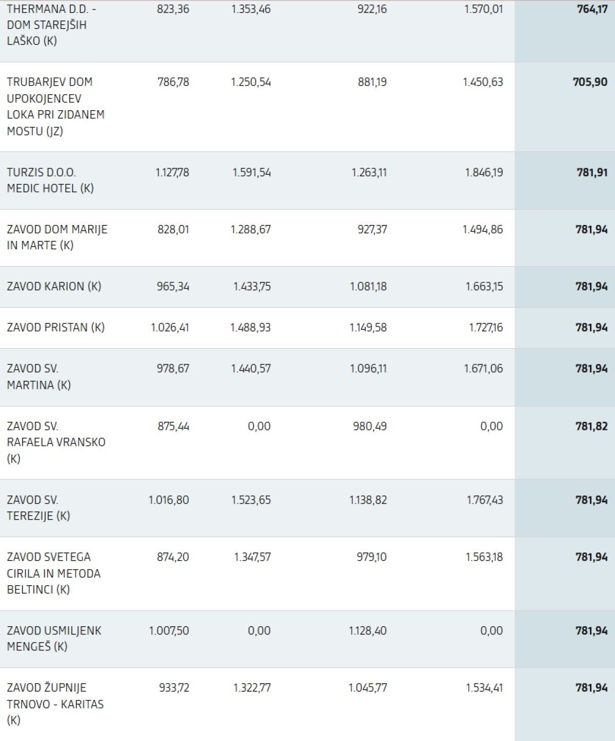Veljavne cene (ZSV): prikaz trenutno veljavnih cen v zavodih za standardno namestitev (brez pribitkov za nadstandardni ali odbitkov za podstandardni bivalni prostor), kot izhajajo iz Pravilnika o metodologiji za oblikovanje cen socialno varstvenih storitev (trenutni sistem)