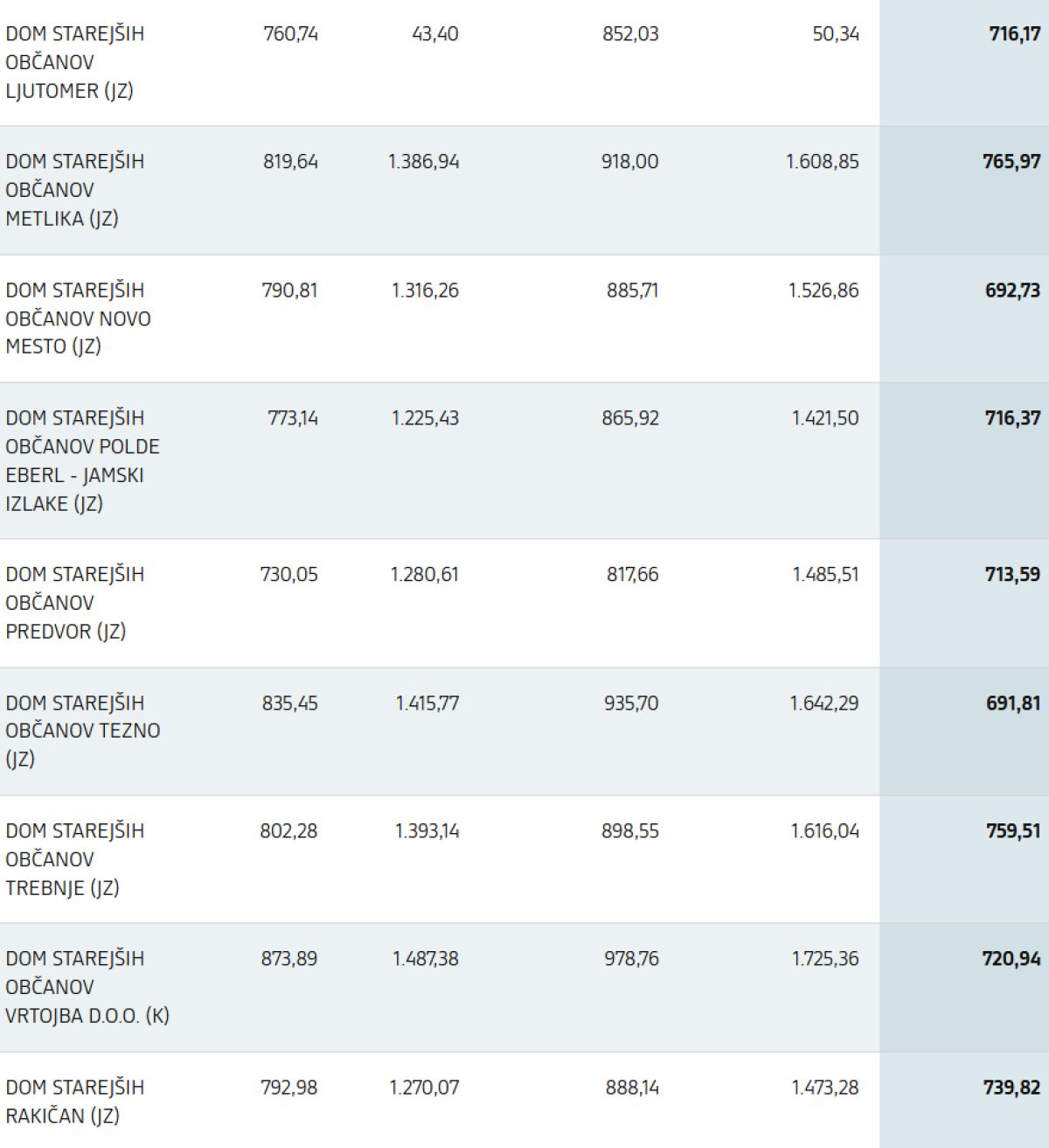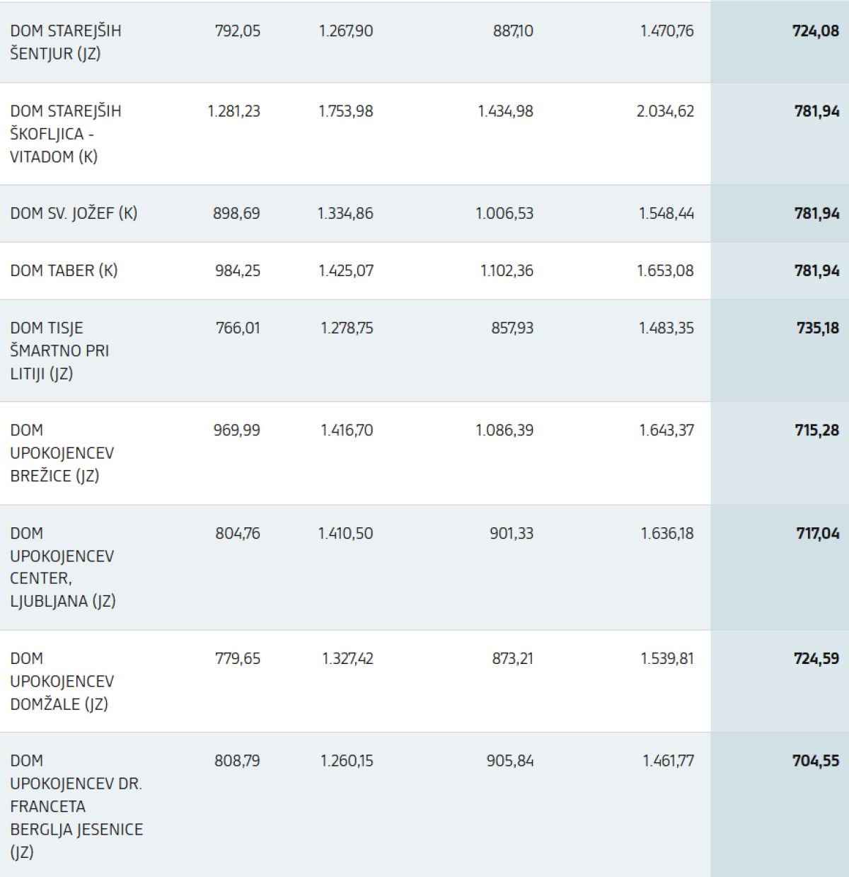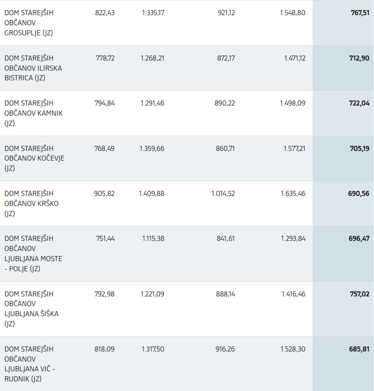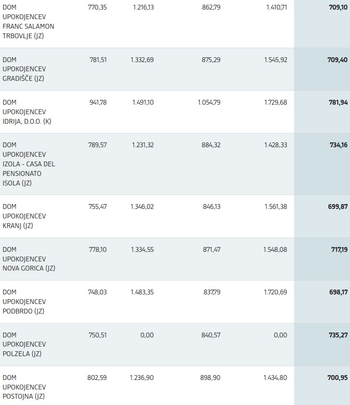 Objavljen je tudi seznam informativnih cen izvajalcev za standardno nastanitev in prehrano, ki stopa v veljavo 1. decembra 2025. Seznam vključuje primerjavo z veljavnimi cenami v domovih za starejše po Zakonu o socialnem varstvu (trenutni sistem) ter s cenami, kot bodo izhajale iz istega zakona po 30. novembru 2025, ko bo prenehalo sofinanciranje stroškov dela v skladu s prvim odstavkom 73. člena Zakona o spremembah in dopolnitvah Zakona o dolgotrajni oskrbi (ZDOsk-1B).