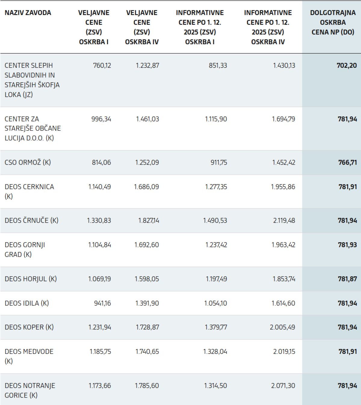 Informativne cene po 1. 12. 2025 (ZSV): informativne cene v zavodih za standardno namestitev (brez pribitkov za nadstandardni ali odbitkov za podstandardni bivalni prostor), kot bodo izhajale iz Pravilnika o metodologiji za oblikovanje cen socialno varstvenih storitev (trenutni sistem) po 30. novembru 2025, ko bo prenehalo sofinanciranje stroškov dela, kot je določeno v 1. odstavku 73. člena novela Zakona o dolgotrajni oskrbi (ZDOsk-1B)