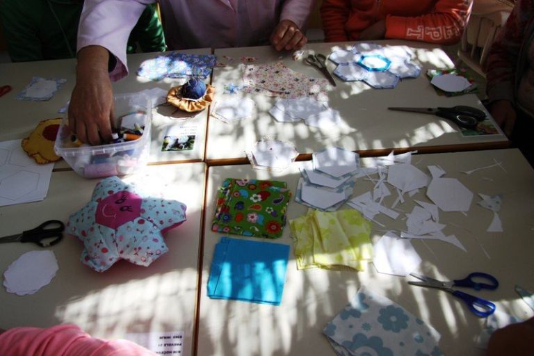 Na prvem srečanju so se naučili, kako poteka postopek izdelave blazinice. Z veliko vnemo in natančnostjo so izrezovali pisano blago in se že lotili prvih šivov. Potrebno bo še veliko vztrajnosti, saj je za nastanek blazinice potrebnih okoli dva tisoč šivov, vendar so bili učenci trdno odločeni, da bodo ta cilj - tako kot že mnod drugih doslej zagotovo dosegli. Dogovorili so se, da jih pobudnica projekta ponovno obišče po jesenskih počitnicah, ko bodo s šivanjem in sestavljanjem blazinic nadaljevali.