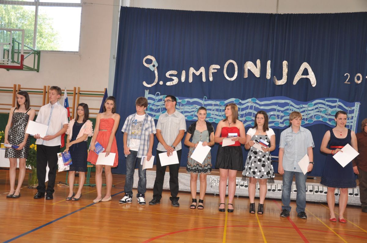 Ravnateljica šole mag. Irena Hlača je podelila priznanja za prizadevnost in uspešnost, priznanja za odličnost ter priznanja za devetletno zvestobo knjigi. Na prireditvi so devetošolci razkrili prisotnim čudovito zgodbo o notah, ki so se znale spoznati, se oblikovati v skupnost in ustvariti tako posebno, novo 9. simfonijo. Tako kot pri notah, je tudi med njimi nastajala zgodba o prijateljstvu. Med otroki, ki so 1. septembra 2002 prišli v šmihelsko šolo. Vsak od njih je bil svet zase. Poseben, enkraten in neponovljiv. Skupaj so 9 let ustvarjali zgodbo o prijateljstvu.