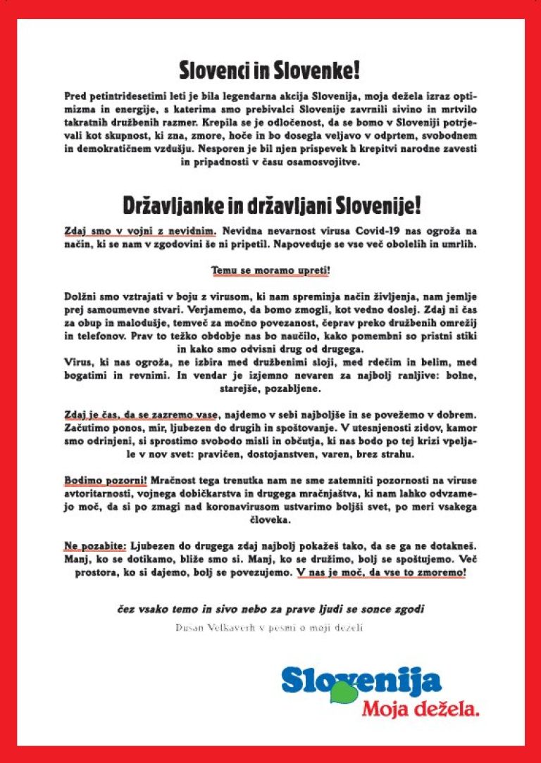Spet smo pred preizkušnjo! Nevidna, pa vendar otipljiva nevarnost virusa Covid-19 nas ogroža na način, ki se nam v zgodovini še ni zgodil. Ampak mi zmoremo! Znamo stopiti skupaj, stremimo k skupnemu cilju, ki je tokrat jasen in oprijemljiv: