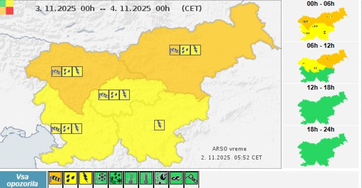 V večernih urah so zahod države zajele padavine, ponekod nastajajo tudi močnejše nevihte. V naslednjih urah se bodo razširile po vsej Sloveniji. Ob prehodu hladne fronte bodo možni nalivi in posamezne nevihte. Meteorologi so tako za sever države v noči na ponedeljek izdala oranžno opozorilo zaradi močnejšega vetra.