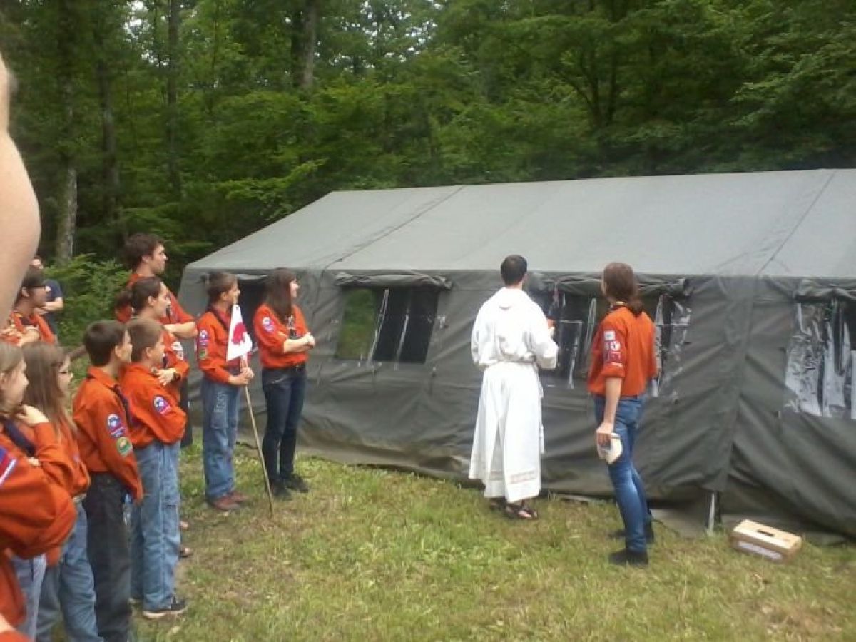 Ob zaključku je g. Janez Jeromen daroval sveto mašo in blagoslovil novi šotor, ki je takoj po blagoslovu prišel prav, saj jim je ponagajal dež. Skavtsko leto 2011/12 se je tako s kosilom in sladkim presenečenjem končalo pod novim šotorom.