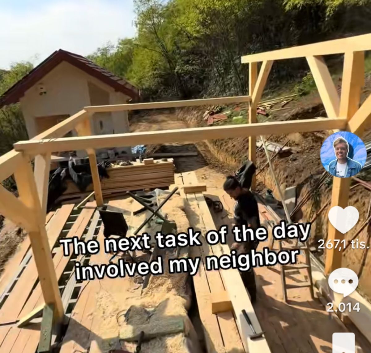 Teraso je ob pomoči soseda že delno zgradil, a se je nekaj komunikacije izgubilo v prevodu. "Ne vem, koliko je pet centimetrov, nisem od tukaj," je soseda opozoril, da prihaja iz ZDA, kjer namesto metričnega uporabljajo imperialni sistem.