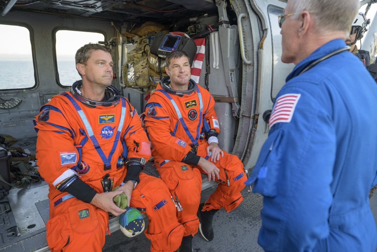Vesoljska kapsula je v morju pristala s pomočjo treh padal, ki so upočasnila njeno pristajanje. Po varnostnem pregledu so člani posadke drug za drugim zapustili kapsulo, s helikopterjem so jih nato premestili na ladjo ameriške mornarice, kjer so opravili prve zdravniške preglede.