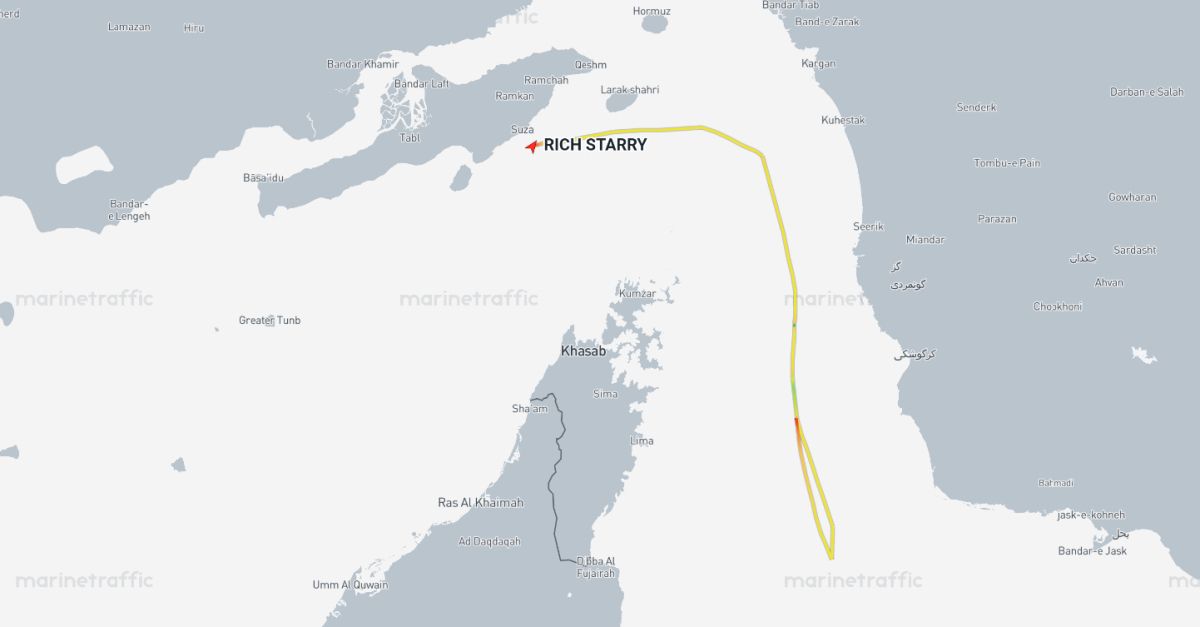 Kot poroča časnik Bloomberg, se je tudi Rich Starry, potem ko je prečkal ožino, v torek dopoldne ustavil v Omanskem zalivu, nato pa je obrnil smer, in sicer na približno istem območju, kjer se je ustavil tudi Elpis. Kot sicer priznavajo strokovnjaki, je temu tankerju podobno kot preostalim tovrstnim plovilom, ki se izogibajo sankcijam, težko slediti, saj vestno uporabljajo motilce signala, ugašajo transponderje in se poslužujejo drugih podobnih manevrov.