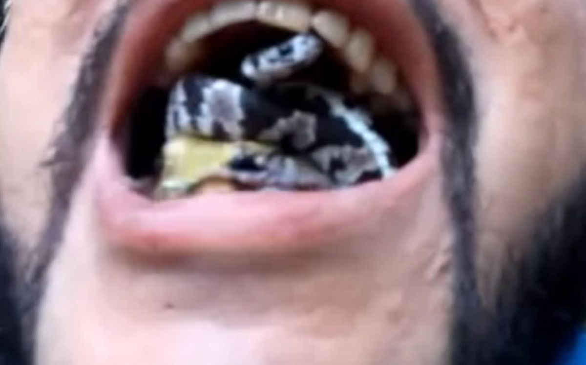 VIDEO: Iz protesta si je v usta stlačil kačji sendvič