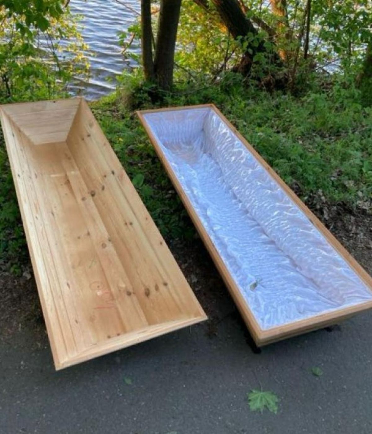 V reki ob obrežju jih je nato zares pričakala svetlo-rjava lesena krsta, na pokrovu katere sta bila ob križu zapisana datum 29. april 2026 in ime pokojnika.