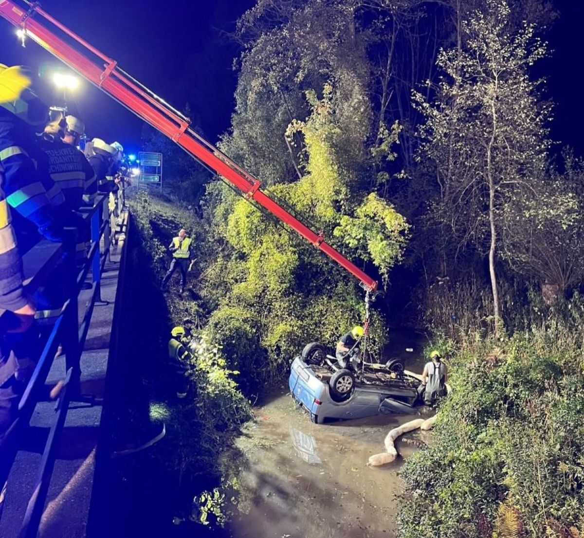 Z avtom prebil most in končal v potoku, z glavo v vodi (foto)