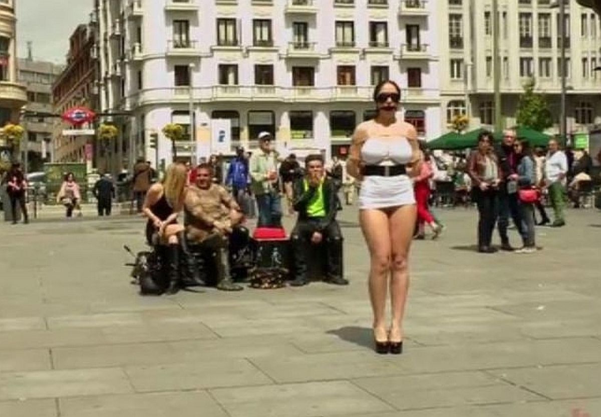 Sprehajalci pred muzejem Reina Sofia v Madridu so bili šokirani, ko so zagledali žensko z razgaljenimi prsmi in zavezanimi očmi.