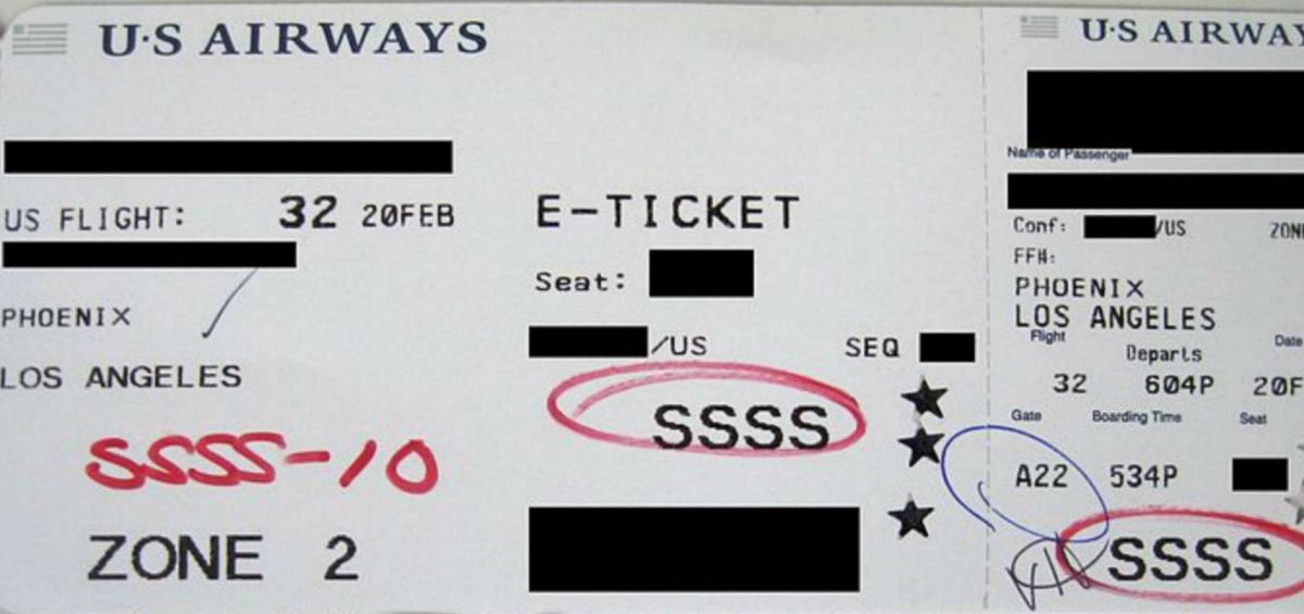 Letalski potniki, namenjeni v Združene države Amerike, lahko na svojem vstopnem kuponu zasledijo kodo SSSS (Secondary Security Screeening Selection) – kar pomeni dodatne preglede (prtljage, osebe in preverjanje identitete) in zamude, tudi do pol ure.