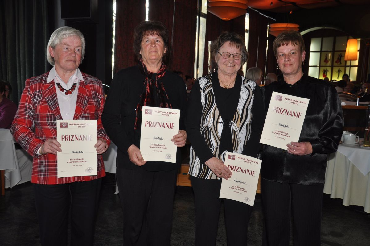 Po izvolitvi delovnega predsedstva so pregledali delo društva. Sledilo je najprej poročilo predsednika, saj se je v letu 2011 izteklo štiriletno uspešno, delovno in bogato obdobje samostojnosti Društva upokojencev Otočec. Plan dela, ki so si ga zastavili v preteklem letu, je bil obširen. Obsegal je naslednje dejavnosti: skrb za starejše in invalide, skrb za zdravje in varnost, šport, rekreacijo in razvedrilo ter meddruštveno sodelovanje. Zelo dejavni so bili v športno-rekreacijskih dejavnostih. Vsako sredo vadijo v metanju pikada in streljanju z zračno puško. Aktivni so tudi športni ribiči. V tem štiriletnem obdobju so pikaderke osvojile naslov državnih prvakinj, vsi športniki pa 40 pokalov ter več priznanj in pohval. Igrajo za svoje veselje, zadovoljstvo in druženje. Dvakrat v mesecu organizirajo pohode v bližnjo in širšo okolico. Med člani je veliko zanimanja, saj se zavedajo, da si s pohodi krepijo telo in duha.