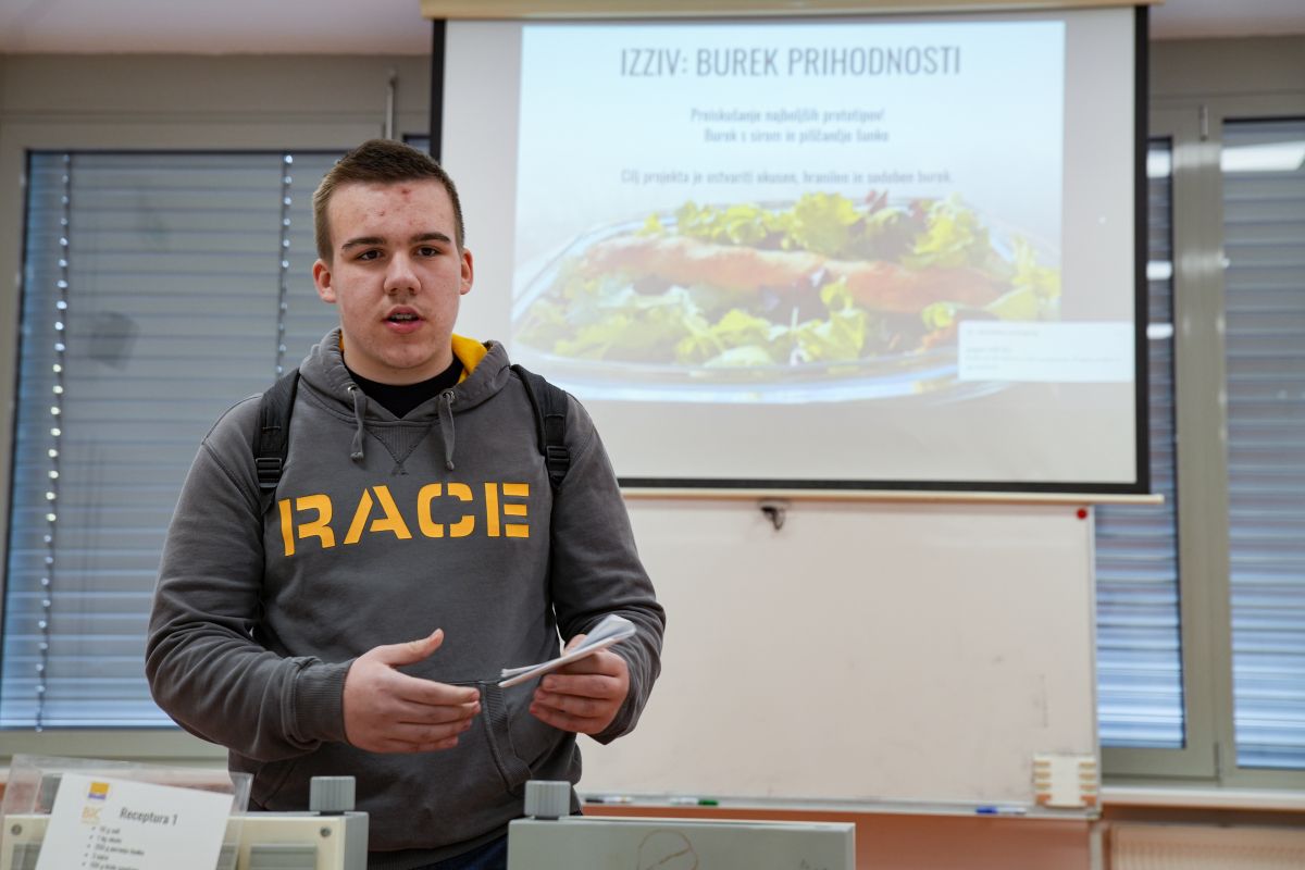 Na koncu nam je ostal zares uravnotežen primerek, ki je najbolj navdušil oba predstavnika Pekarne Pečjak in predstavnika revije Dober tek. Dijaki tretjega letnika programa živilsko-prehranski tehnik Tadeja Matičič, Anja Lebar, Jošt Smrekar, Borut Stojanovič, Milica Bjelić, Daša Brovč in Eva Hajdinjak so pod mentorstvom Jake Mihelčiča in Sabine Dremelj pripravili burek z nadevom iz pečenih piščančjih prsi (v obliki salame), skute, kajmaka in kisle smetane.
