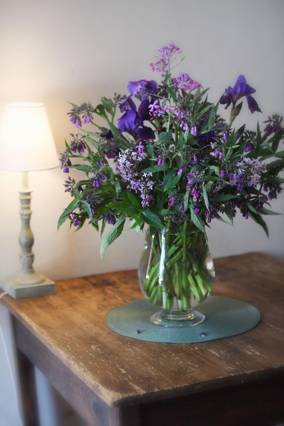 Gabezu delajo družbo prvi cvetoči irisi in dišeči cvetovi španskega bezga. Dodala sem še lunarijo, ki s svojimi vijoličnimi cvetovi lepo poveže vse barve v šopku.