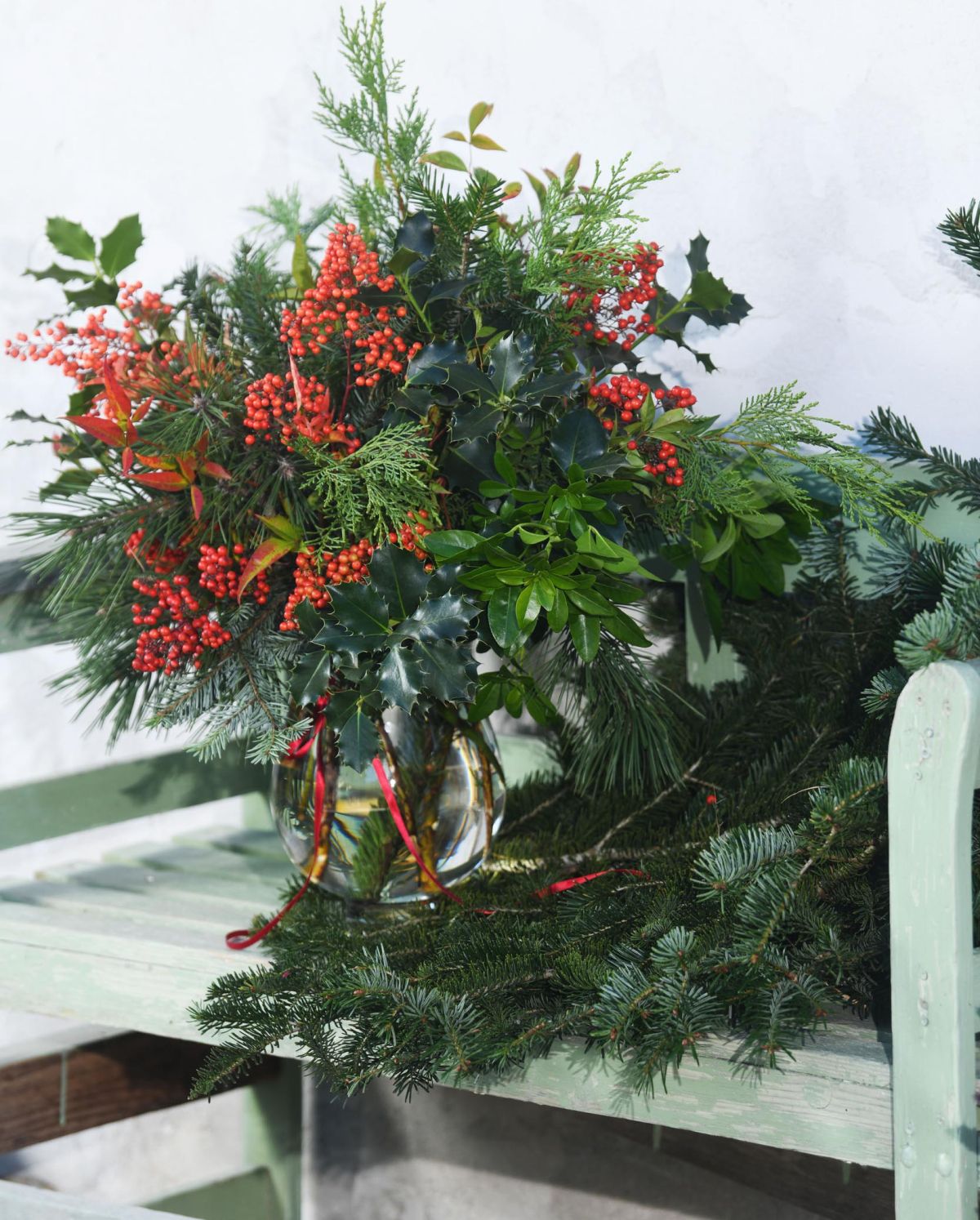 Vsaka rastlina ima svoj odtenek zelene barve, vsaka ima svojo teksturo, nekatere imajo bleščeče liste, druge čisto zamolkle, žametne … Popestrite ga z rdečeoranžnimi jagodami nandine (Nandina domestica) in svileno ali žametno rdečo pentljo.