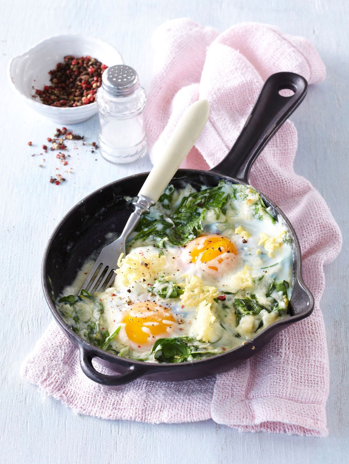 2. Zmes začinite s soljo in poprom, razdelite v posodice, dodajte jajca in pecite v pečici pri 190 °C 15 minut. Postrezite s kruhom.