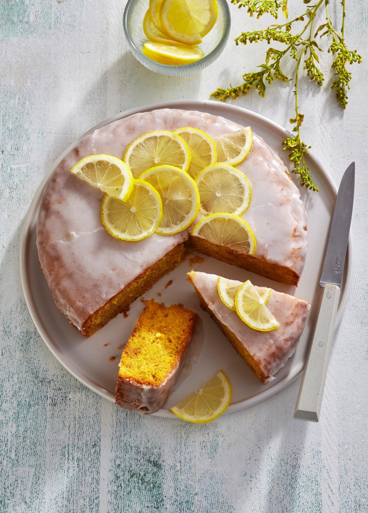 4. Iz sladkorja, limonovega soka in vroče vode (ki jo dodajajte postopoma in po potrebi – morda je sploh ne boste potrebovali) naredite glazuro in jo namažite po celotni površini popolnoma ohlajene sladice. Pustite, da se strdi. Okrasite z limono in postrezite.