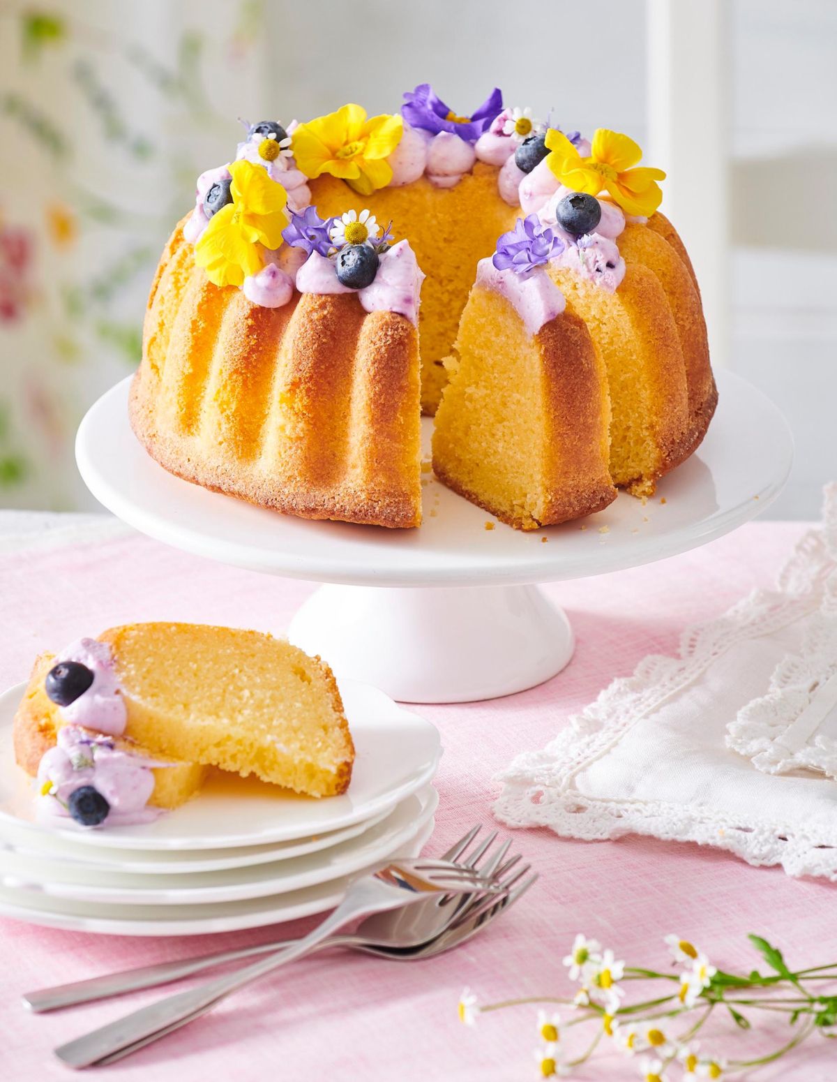 Limonin kolač je popolna pomladna poslastica za vse, ki obožujejo mehak in sočen biskvit z nežno aromo limone. Pika na i so svilnata borovničeva krema in užitni cvetovi.