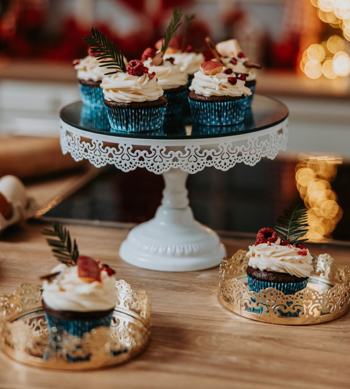 5. Izberemo poljubni nastavek in kremo nabrizgamo na kolačke. Okrasimo z liofiliziranim sadjem, granatnim jabolkom in poljubno praznično dekoracijo.