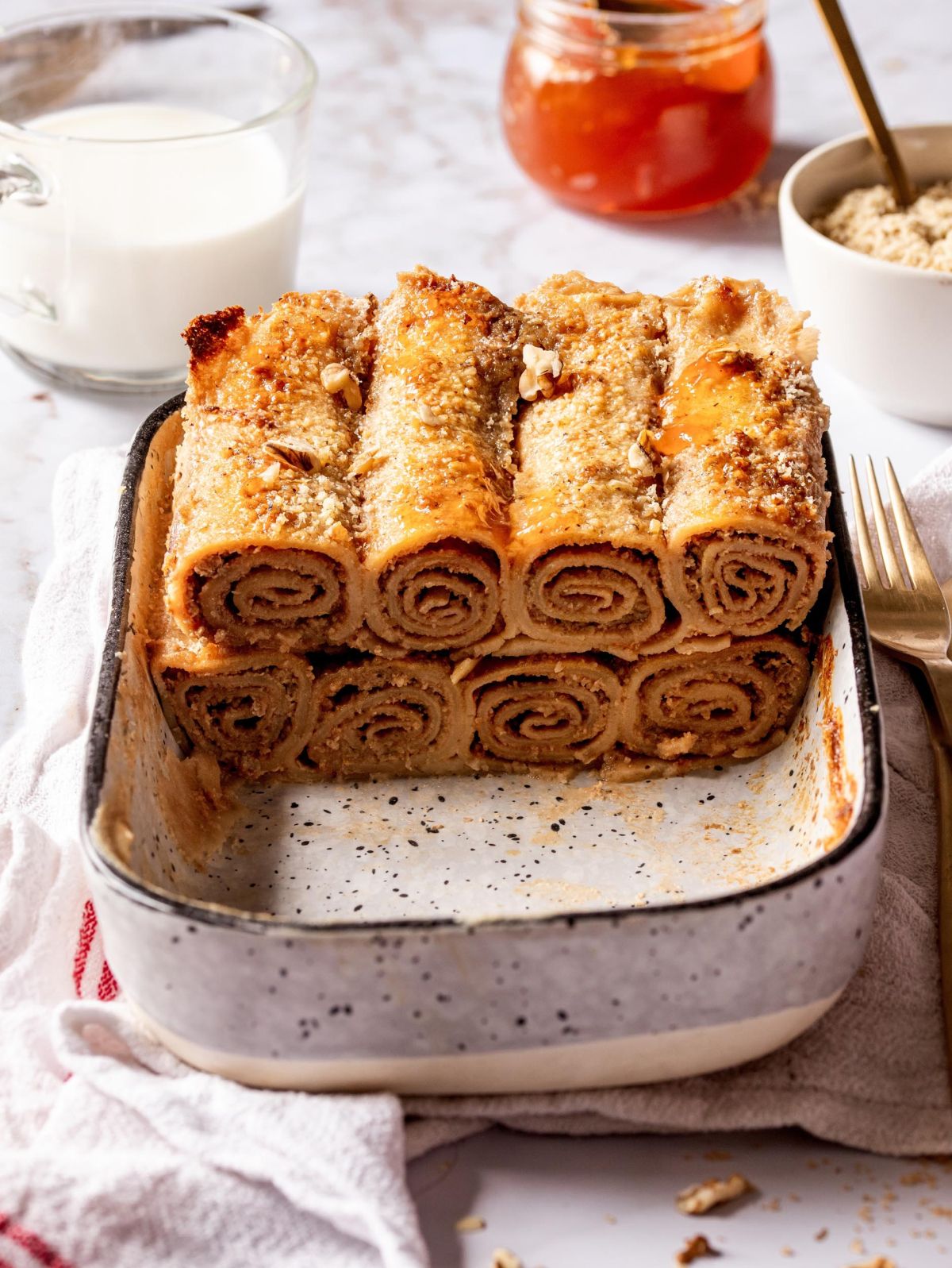 2. Zmlete orehe poparimo z vročim mlekom, dodamo malo sladkorja in kanček ruma (nadev kot za potico). Z nadevom namažemo palačinke in jih zložimo v trikotnike (ali v zvitke).
